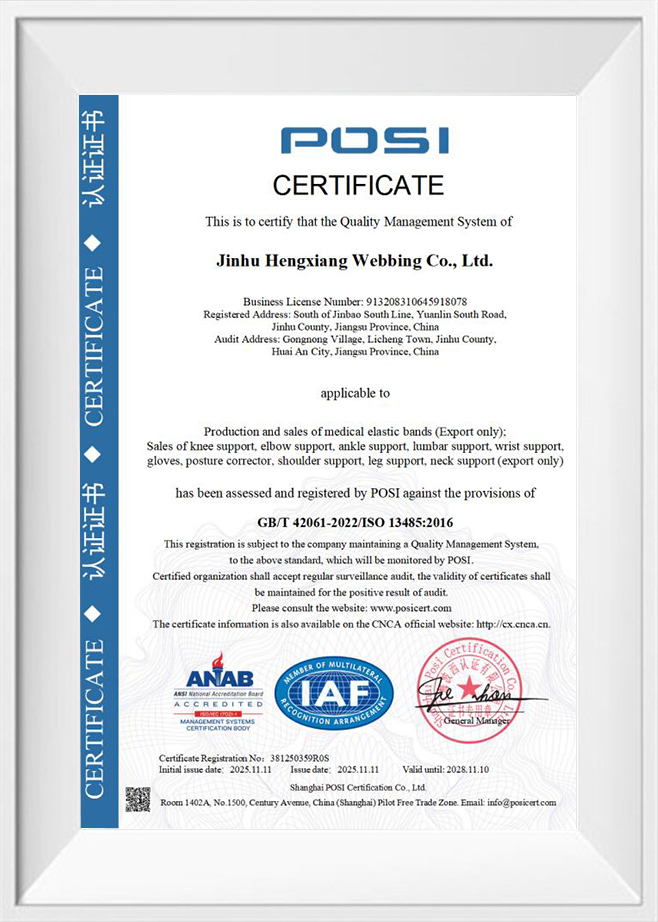 Công ty TNHH Dây đai Jinhu Hengxiang Được thành lập vào năm 2005, tọa lạc tại huyện Kim Hồ, thành phố Hoài An, tỉnh Giang Tô, Trung Quốc, với giao thông thuận tiện. Chúng tôi là nhà sản xuất chuyên nghiệp tham gia vào nghiên cứu, phát triển, sản xuất, bán hàng và dịch vụ về dây đai đàn hồi và dây đai không đàn hồi, đặc biệt được sử dụng cho hỗ trợ thể thao và nẹp chỉnh hình. Chúng tôi thực hiện kiểm soát chất lượng nghiêm ngặt trong mọi quy trình, từ tìm nguồn cung ứng vật liệu, chế biến và thử nghiệm đến đóng gói. Với dịch vụ khách hàng chu đáo, đội ngũ nhân viên giàu kinh nghiệm luôn sẵn sàng thảo luận về yêu cầu của bạn và đảm bảo sự hài lòng tuyệt đối của khách hàng.